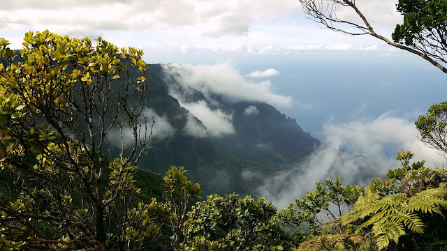 In the park, we hiked Pu'u Okila Trail at the Kalalau Overlook. It's a 1.7 mile trail out along the ridge above the Kalalau Valley. It's mind blowing. The valley fills with clouds, overflows the trail, clears, and cycles again. It's stunningly beautiful, saturated with color, and has amazing ocean views.